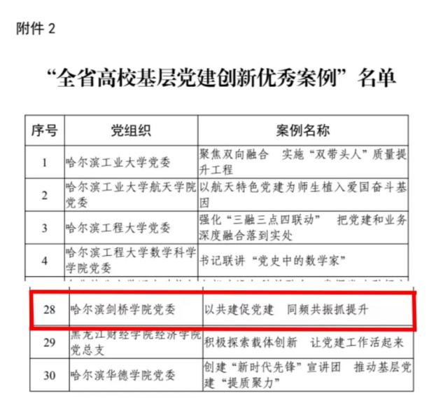 哈尔滨剑桥学院党建案例入选“全省高校基层党建创新优秀案例”。学校党委打造1332党建模式,激发党组织活力。借助与黑大结对共建平台,学校所有二级学院党总支实现了与黑大相应党组织100%“联建共建”,联合开展“主题党日”活动、“发展对象”党课培训,联合举办“贯彻发展党员工作规程”等培训,工作成效被学习强国等主流媒体报道。