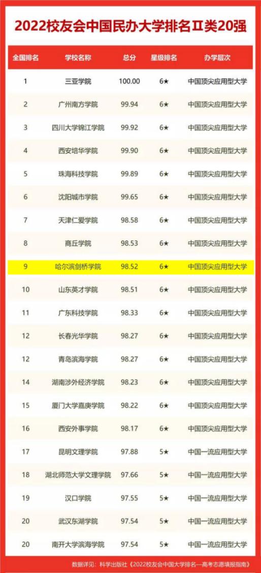 《2022校友会中国大学排名—高考志愿填报指南》最新发布校友会2022中国大学排名榜单。在中国民办大学排行榜(Ⅱ类)中,哈尔滨剑桥学院位列第9名。