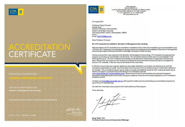澳洲会计师公会(CPA Australia)来函确认,哈尔滨剑桥学院会计学学士学位课程成为澳洲会计师公会认证课程,成为中国华北东北地区唯一一所通过该认证的民办高校。