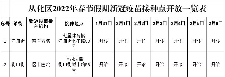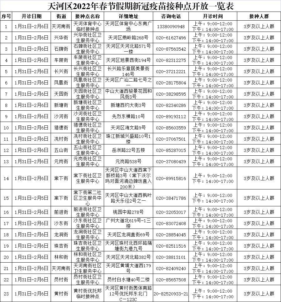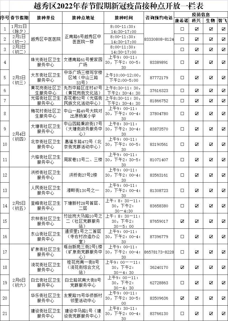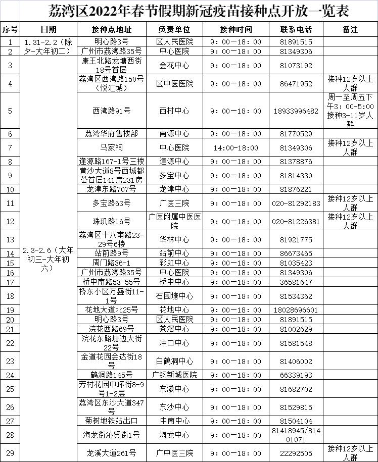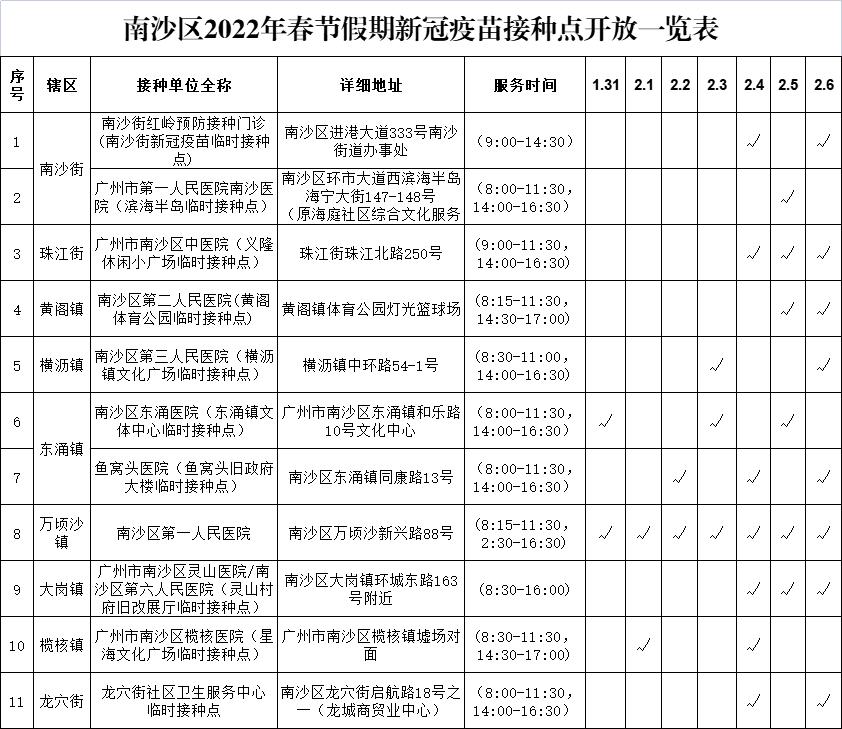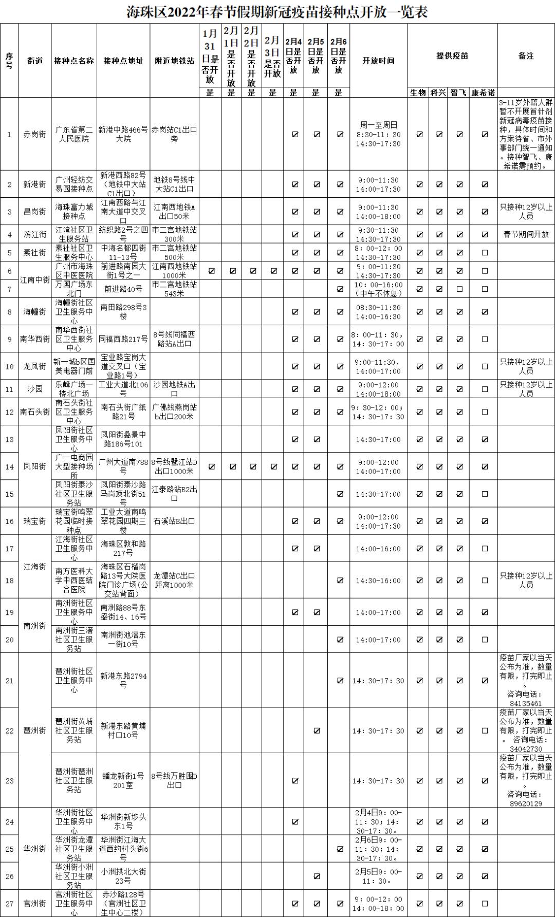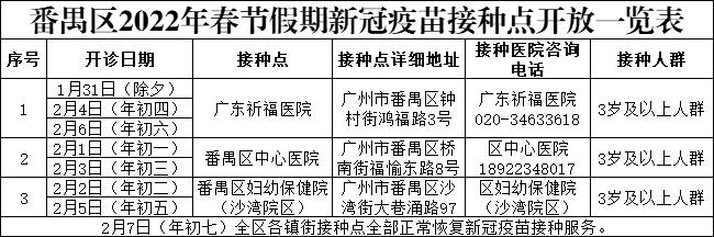 在全国上下喜迎虎年春节与家人团圆之际,为方便外地返穗人员和广大群众及时接种疫苗,广州市新冠疫苗接种点春节期间“不打烊”,农历腊月二十九至正月初六春节放假期间,开放服务的接种门诊均安排专人值班值守。