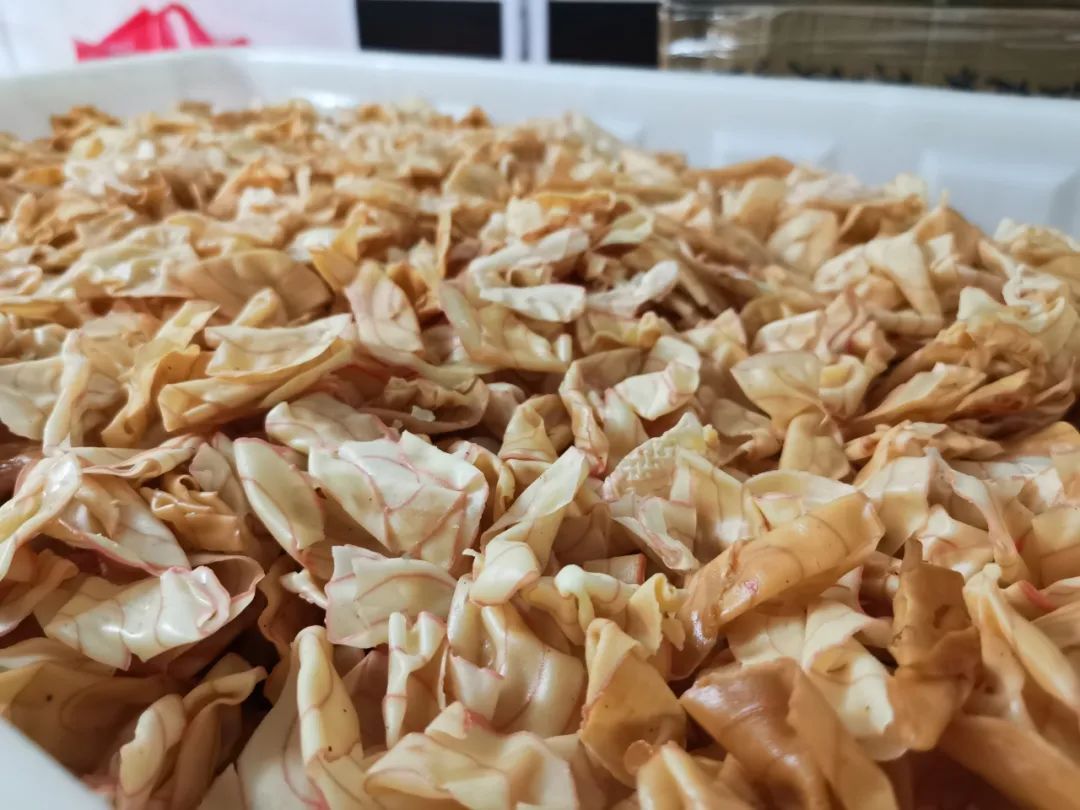 张祥华牛耳饼店是三江镇当地一家经营了40多年的老店,据店主张良超介绍,牛耳壳用奶油和南乳来调味,刀切时必须快、匀、薄,三者缺一不可,切出的每一片牛耳壳轻薄如纸,再选用纯正的花生油炸,刚刚炸透烘干的牛耳壳薄如纸张,呈金黄色,绘以艳红的螺旋花纹,温热尚未消弭,飘散出南乳特有的脂香与酒香。“做牛耳壳既是技术活,也是体力活,每天凌晨1时左右,一家人就得起床,和面、切片、上油锅,这三个环节都很有讲究,此外,还加入了江门风味的南乳作为辅料,所以做出来的牛耳壳也别有风味。”张良超说。