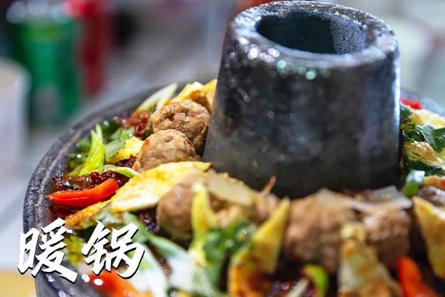 暖锅俗称“暖锅子”,圆形,上大下小,上为锅,下为锅膛兼底座。锅大如盆而中空置炭火,配以排骨、酱肉、蔬菜、粉条等各样食材炖煮,香气四溢,吃起来麻、辣、暖、香,越吃越爽。
