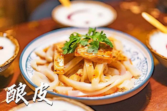 酿皮子,甘肃人也俗称之为 “让皮子”,色泽橙黄而透明,食用时将酿皮子切成细条,上面再放上几块切成薄片的面筋,浇上辣椒油、醋、蒜末、酱油、芥末等佐料,其色悦目,香味诱人。