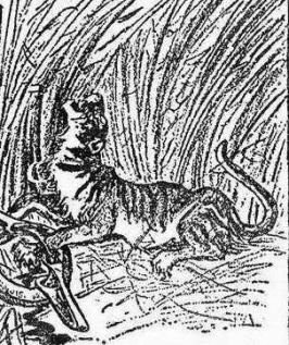 到了1899年,瑞典探险家斯文·赫定也抵达了罗布泊。这时期罗布泊由于水流来源日渐枯竭,已经成为人类难以生存的荒漠。但是,斯文·赫定初来的第一夜,还是受到了虎的惊吓。在斯文·赫定的考察报告里,留下了一张虎落陷阱的速写:一只虎困在罗布人的陷阱里,前左爪被一个圆形的夹子夹住,那只老虎蹲着身子仰天长啸,似乎想一跃而起冲出陷阱。