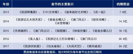 2014年春节档总票房14.5亿,几乎是前一年的两倍;2015年至2017年三年间,春节档票房从18.1亿涨至34.2亿。