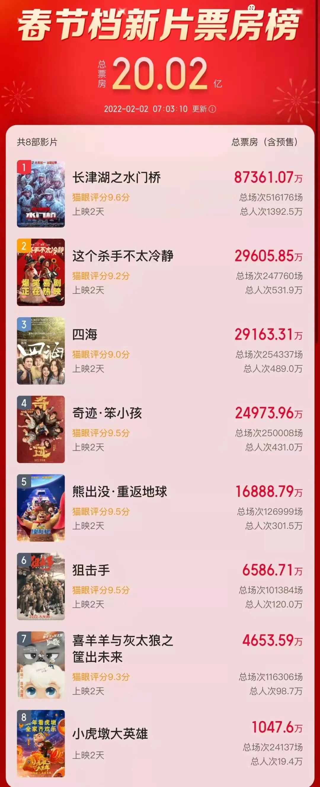 据猫眼专业版,2022年2月2日7时,2022春节档新片总票房(含点映)破20亿。其中,《长津湖之水门桥》以8.7亿元票房遥遥领先,《这个杀手不太冷静》票房2.96亿元,《四海》票房2.9亿元。