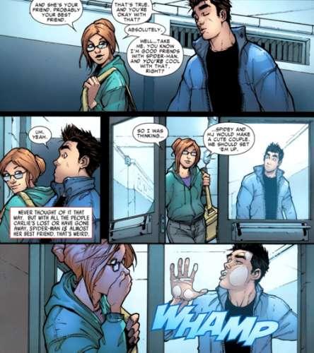 玛丽对彼得的感情很不自信,也是分分合合很多年,经常吃蜘蛛侠和别人的醋,例如黑猫(Black Cat)。