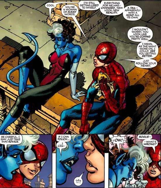 幻影猫与蜘蛛侠的恋爱故事发生在X战警与蜘蛛侠的交叉漫画里,在该系列中幻影猫清楚知道彼得·帕克即是蜘蛛侠,但编剧们有意打造成幻影猫与彼得·帕克谈恋爱和幻影猫与蜘蛛侠谈恋爱两段分开的感情线。