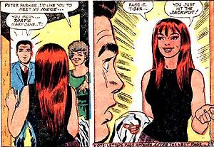 实际上玛丽出现在《神奇蜘蛛侠》漫画中的时间比格温还早一年(即1964年)。但玛丽正式进入蜘蛛侠的故事却在1966年。当年11月《神奇蜘蛛侠》第42期,彼得打开门,正好与他一直躲避的玛丽迎面碰上,这是彼得也是读者第一次看清楚玛丽的脸,一个美丽青春的红发辣妹,然后她说出了美漫史上著名的台词之一:“嘿,英雄,面对现实吧,你中大奖了。”