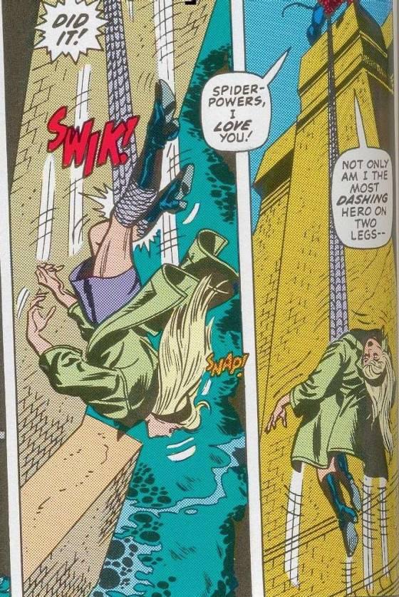 为了表明玛丽是格温之后,蜘蛛侠生命中最重要的女人,编剧们再一次编排了蜘蛛侠与绿魔的对决,没错,绿魔这次又把玛丽从桥上扔了下去,彼得从格温的事故中吸取了教训,用多根网状蜘蛛丝附着在她的身体上。
