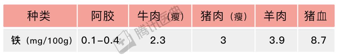 阿胶中的铁含量其实非常少,每100克只有0.1~0.4毫克铁,只接近猪肉的1/10[4,5]。