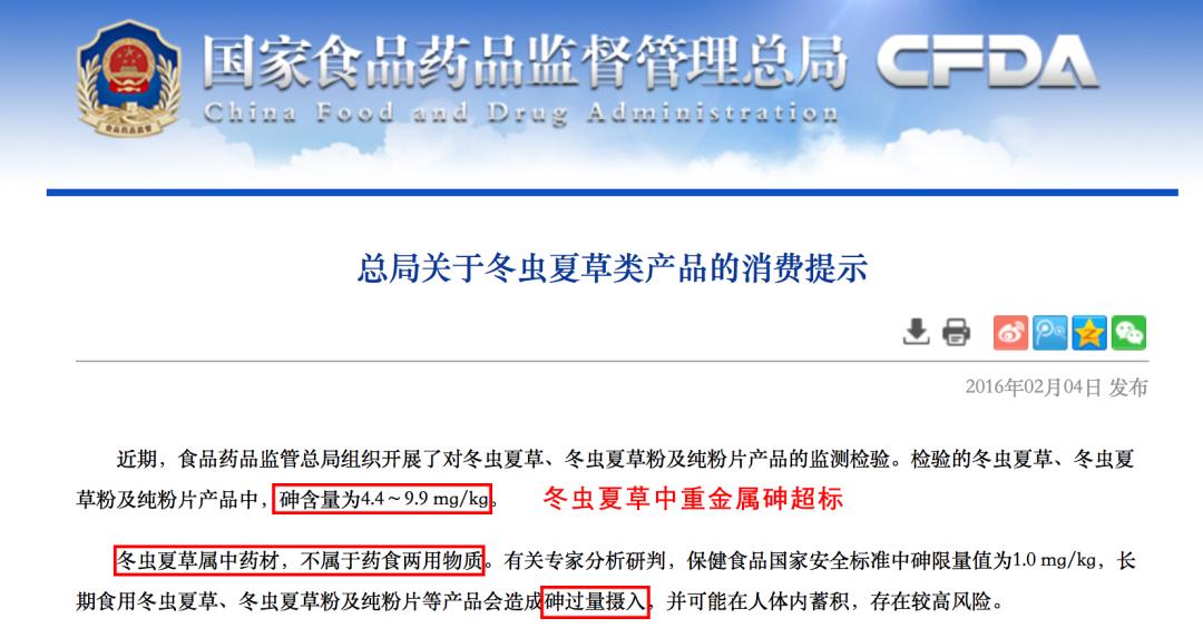 2016年,原国家食药监总局对冬虫夏草的一次抽检发现,冬虫夏草及其制品中重金属砷的含量超标4-10倍。