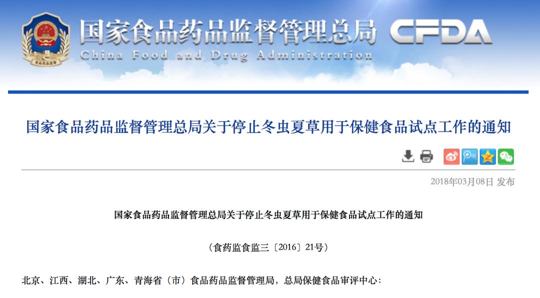 2018年,原食药监局重申“冬虫夏草不属于保健品”,并提醒“冬虫夏草属中药材,不属于药食两用物质” [9]。