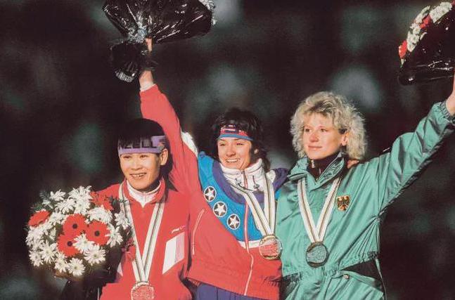 1992年,法国阿尔贝维尔,冬奥会女子速度滑冰1000米的颁奖仪式。叶乔波(左)获银牌