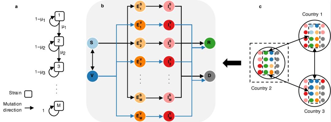 图1. 多变种集合种群模型图示:(a)多变种模型,(b)SVEIRD模型,(c)基于SVEIRD的集合种群模型。3. 高收入国家