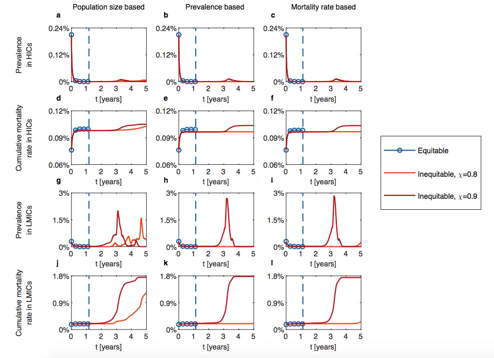 模型假设,在完全公平的疫苗分配方式下,全球产出的疫苗不按照各国的富裕程度,而按照一定的优先分配标准均等地分给各个国家;在不公平的疫苗分配方式下,高收入国家拥有的疫苗数量占全球产出疫苗总量的绝大部份,剩余的疫苗将照一定的优先标准均等地分配给中低收入国家。文中考虑了四种疫苗优先分配标准:人口数量、发病率、流行率和死亡率。