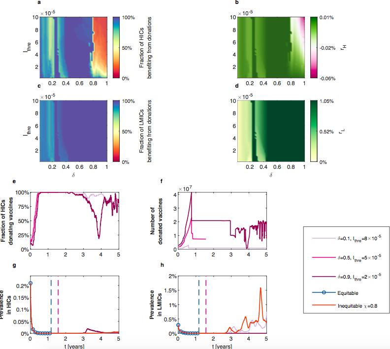 由于全球疫苗产量有限、高收入国家以自身利益优先等原因,完全公平的疫苗分配方式很难实现。如果高收入国家能将多余的疫苗捐赠出去,将有可能走出疫苗分配的困境,加速疫情的终结。为此,作者对一系列疫苗捐赠方案进行建模,并分析了其对未来五年内全球疫情走向的影响。模型假设,在同意捐赠的疫苗分配方式下,只要本国疫情稳定(国内流行率低于Ithre),高收入国家会将一定比例(由δ表示)的自身疫苗供应量捐赠给国际组织,如新冠肺炎疫苗实施计划(COVAX)。这些疫苗会按照一定的优先标准均等地分配给中低收入国家。