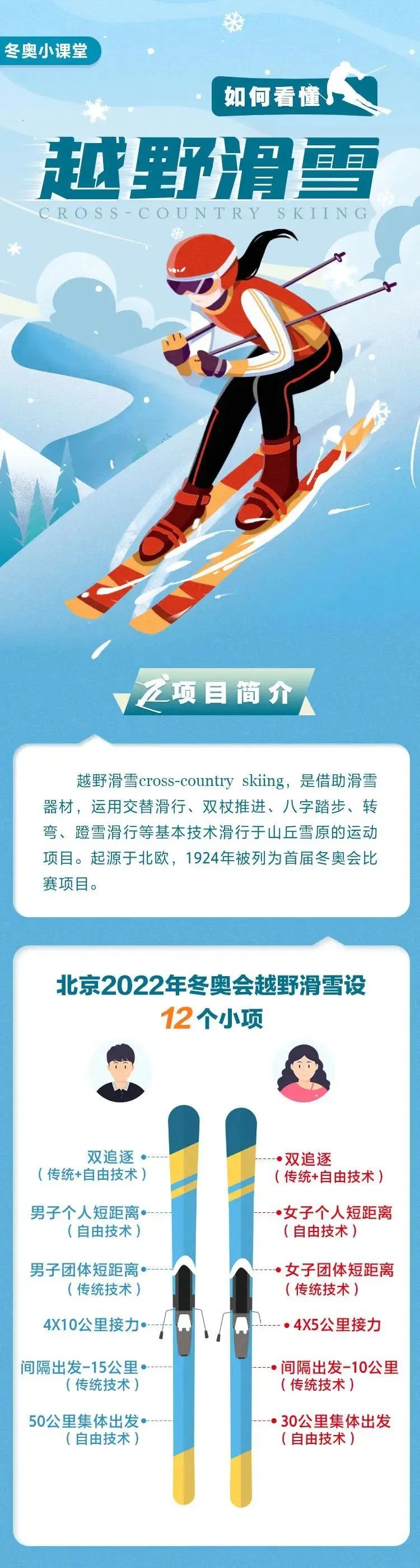 越野滑雪是借助滑雪用具,运用登山、滑降、转弯、滑行等基本技术,滑行于山丘雪原的运动项目,被称为“雪上马拉松”。起源于北欧,又称北欧滑雪,是世界运动史上最古老的运动项目之一。