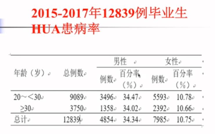 但该结果受到了质疑,部分专家认为高校新生经历了残酷的高考,活动少、饮食过盛且不规律,可能对高尿酸血症有促进作用。因此对1万余名高校毕业生进行了调查,结果显示高尿酸血症患病率并无明显差异,男性高尿酸血症的发病率为34%,女性的高尿酸血症发病率也有10.7%。