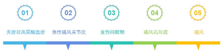 痛风临床表现分为无症状高尿酸血症、急性痛风关节炎、发作间歇期、痛风石形成和痛风几个阶段。