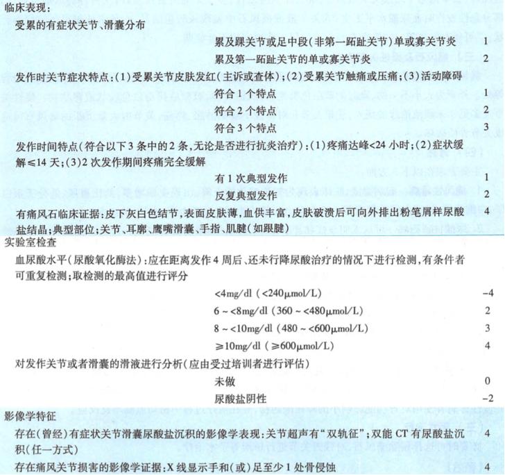 分类标准目前采用2015年美国风湿病学会(ACR)和欧洲抗风湿病联盟(EULAR)共同制定的痛风分类标准。