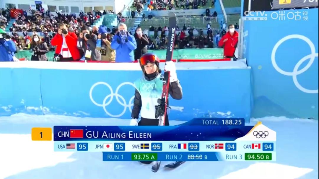 2月8日上午,谷爱凌出战自由式滑雪女子大跳台的决赛。在前两跳结束后排名第二的情况下,第三跳挑战了自己从未训练过的超高难度运动1620并顺利完成,最终以总分188.25分排名第一,顺利拿下了自己首战冬奥的第一枚金牌,这也是中国冬奥历史上首枚女子雪上运动的金牌。