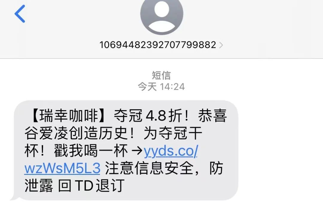 他们先是给用户们发了一条短信,大概的意思是,为了庆祝谷爱凌夺冠向全体用户发放4.8折券。