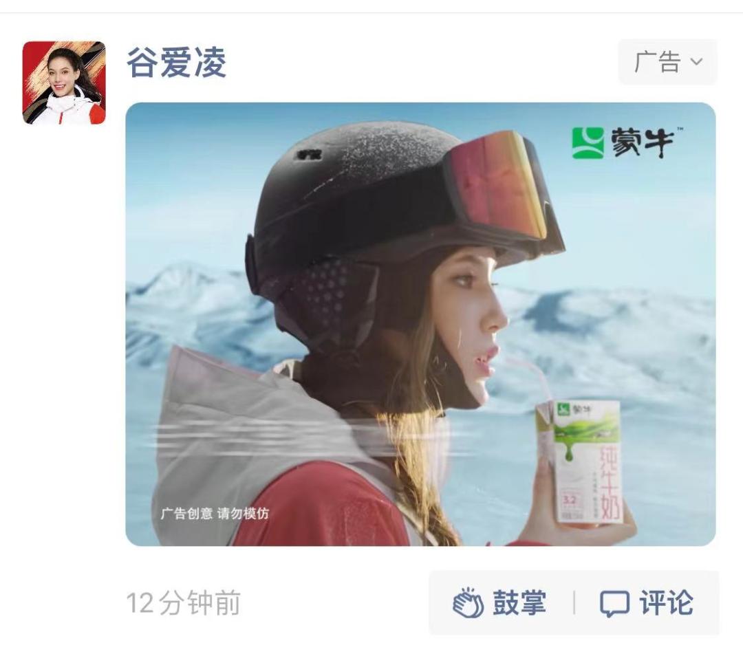 昨天才靠着为中国女足“率先”提供1000万奖金获得称赞的蒙牛,又再次在微信朋友圈投放了推送广告,邀请全体微信用户为谷爱凌“鼓掌”。