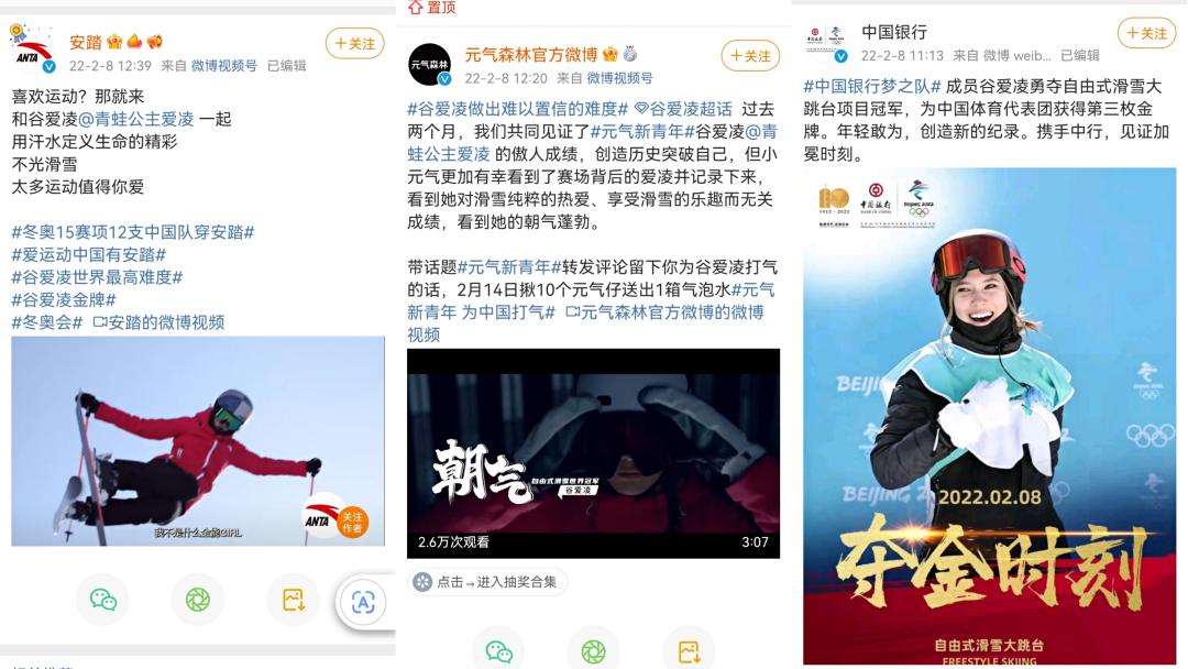 此外,元气森林、中国银行、安踏等26家品牌方相继发布了祝贺谷爱凌夺冠的微博,其中还有不少选择了将谷爱凌的相关微博置顶,以显示自己与冠军之间的亲密关系。