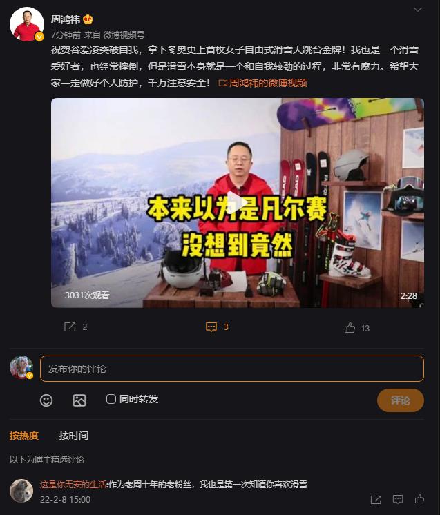 就连周鸿祎都忍不住发布了祝贺谷爱凌夺冠的微博,估计他本人也在后悔,怎么就没有邀请谷爱凌与360谈谈合作呢。