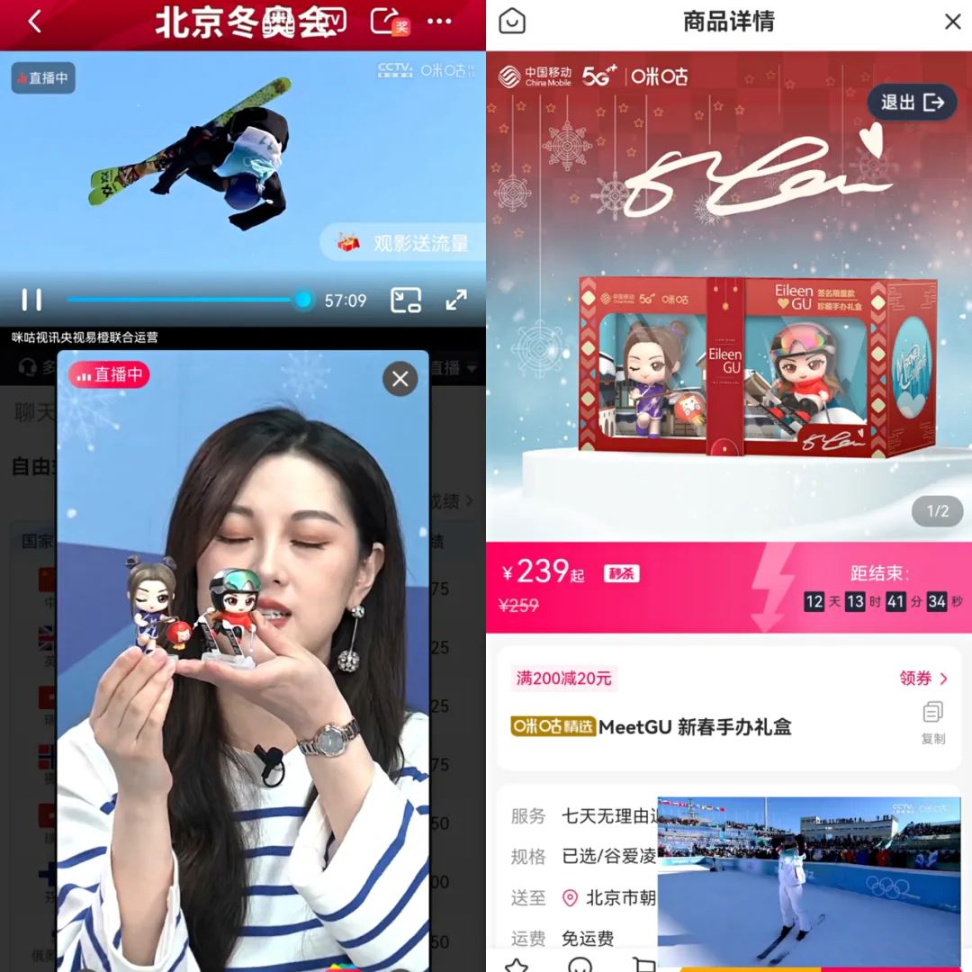 而作为拥有直播版权的平台,咪咕在此次冬奥直播中大放异彩,自然在赛前,就对谷爱凌的这场比赛下了十足的功夫。就在谷爱凌的比赛直播进行的同时,咪咕的线上商城直播也在同步开启。谷爱凌在这边的跳台上坐着热身,那边两位主播在演播室展示着谷爱凌的手办玩偶。据主播亲自讲述,这两只售价239元的手办是谷爱凌授权的,之后肯定会溢价,现在入手便是最合适的时机。