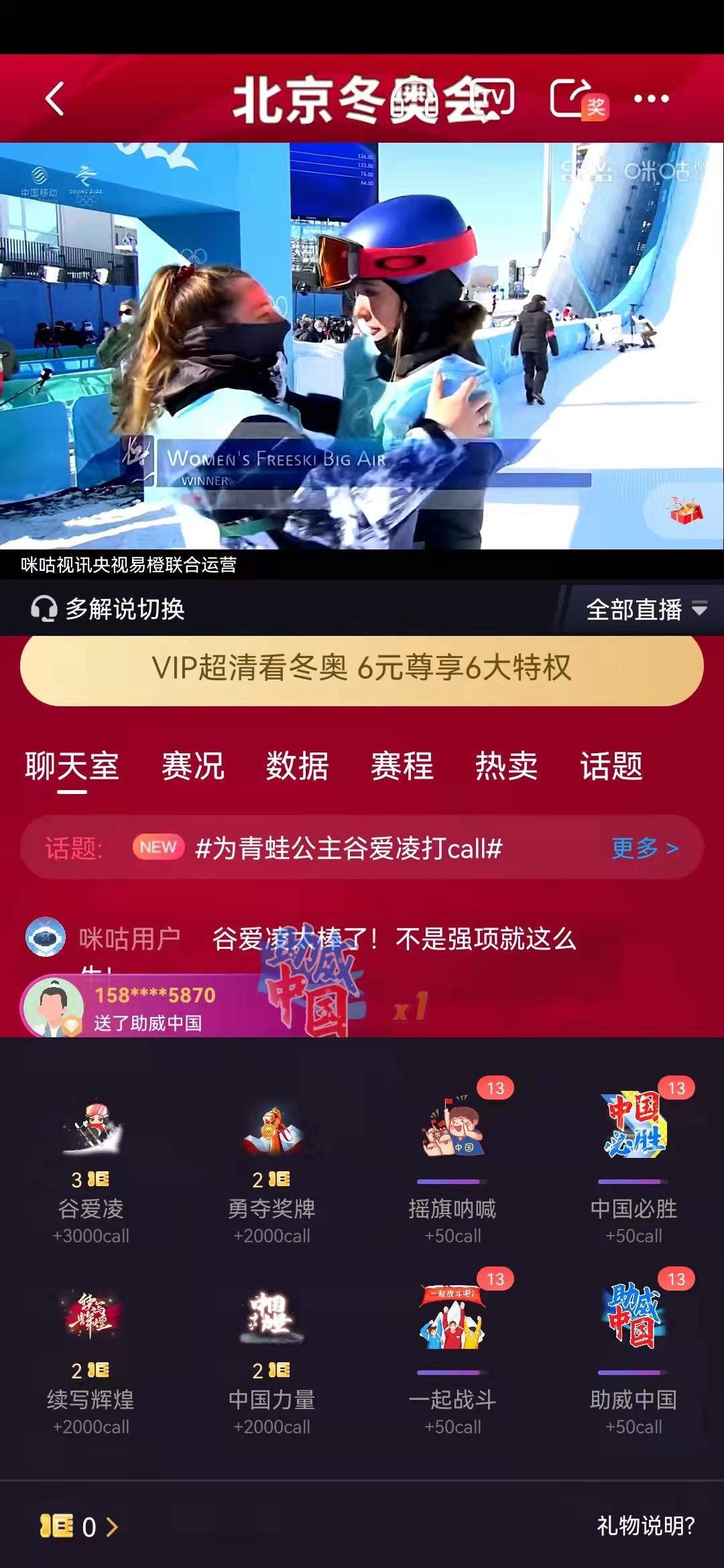 好家伙,这就是黄牛的上层代理吗?同时,咪咕还开启了“打赏功能”,3张“通看卷”即可为谷爱凌增加3000call。礼物说明则显示,一张通看卷的价格平均为1.5元,也就是说4.5元即可为谷爱凌打call一次。