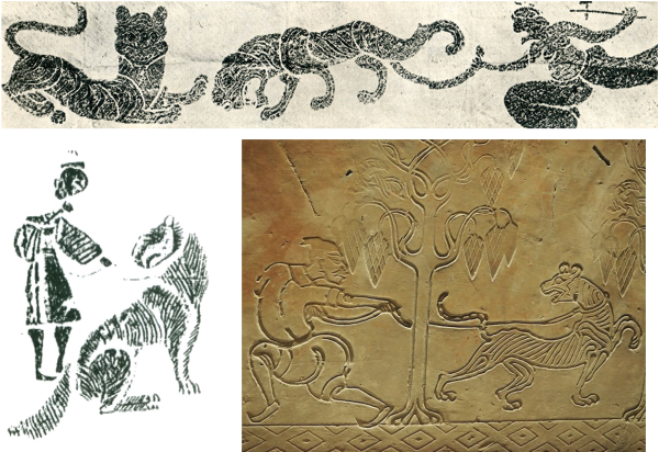(上)东汉斗虎画像砖拓片,南阳汉画馆藏;(左下)东汉武士驯虎画像砖拓片,新野汉画像砖博物馆藏;(右下)东汉驯虎画像砖(局部),上海博物馆藏
