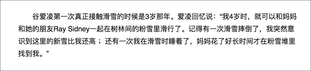 2017年,腾讯体育一篇题为“14岁混血美少女9夺滑雪冠军 她说:我是中国人”的文章中写道:“谷爱凌第一次真正接触滑雪的时候是3岁那年。爱凌回忆说:‘我4岁时,就可以和妈妈和她的朋友Ray Sidney一起在树林间的粉雪里滑行了。记得有一次滑雪摔倒了,我突然意识到这里的新雪比我还高 ;还有一次我在滑雪时睡着了,妈妈花了好长时间才在粉雪堆里找到我。’“
