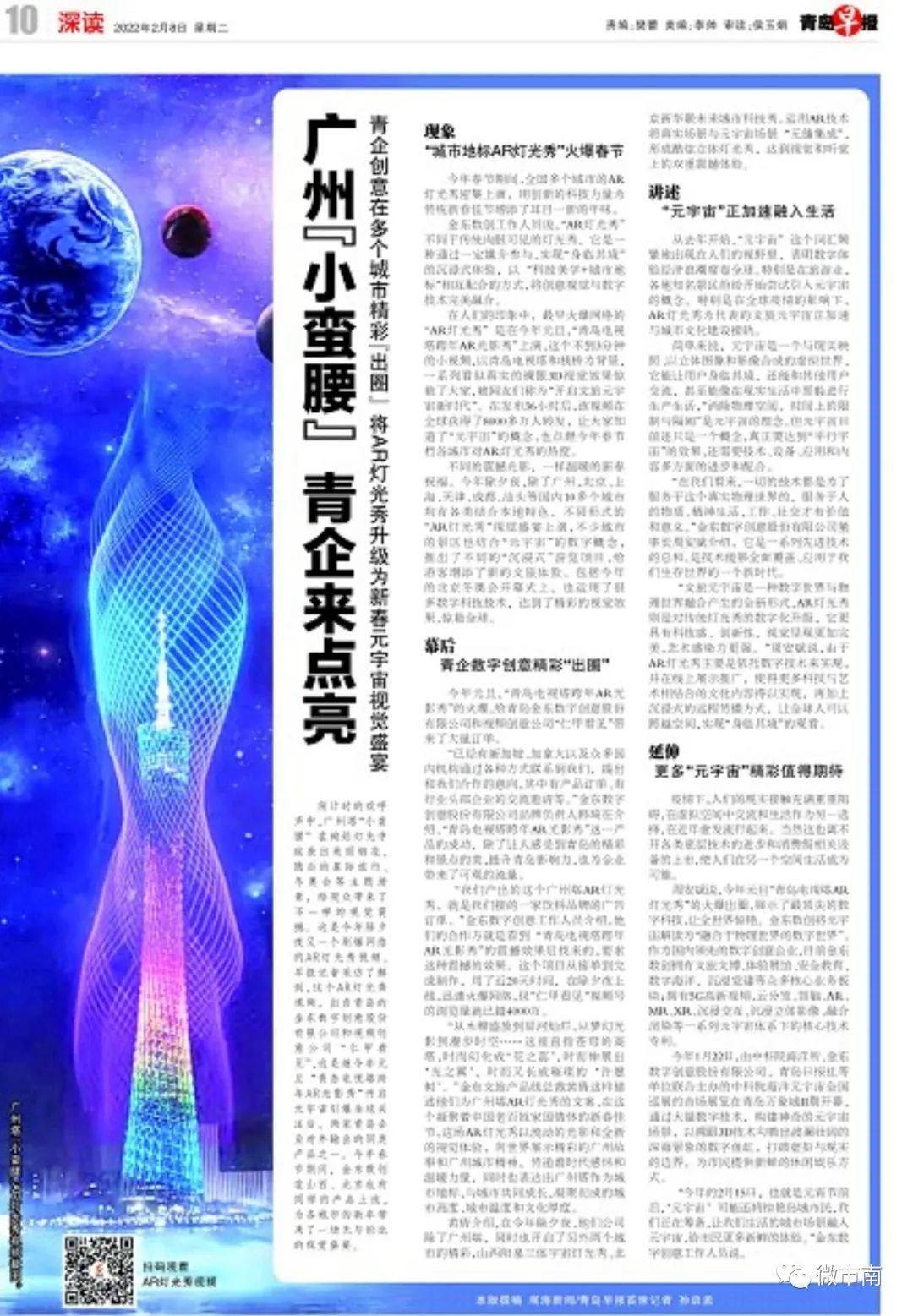 倒计时的欢呼声中,广州塔“小蛮腰”在绚烂灯光中绽放出美丽烟花,随后的星际旅行、冬奥会等主题场景,给观众带来了不一样的视觉震撼。这是今年除夕夜又一个刷爆网络的AR灯光秀视频。早报记者采访了解到,这个AR灯光秀视频,出自青岛的金东数字创意股份有限公司和视频创意公司 “仁甲看见”,这是继今年元旦 “青岛电视塔跨年AR光影秀”开启元宇宙引爆全球关注后,两家青岛企业对外输出的同类产品之一。今年春节期间,金东数创在山西、北京也有同样的产品上线,为各城市的新年带来了一场无与伦比的视觉盛宴。现象 “城市地标AR灯光秀”火爆春节