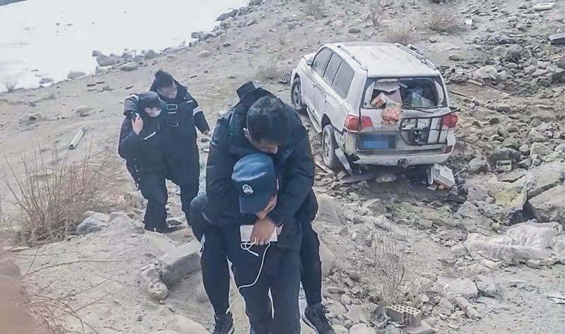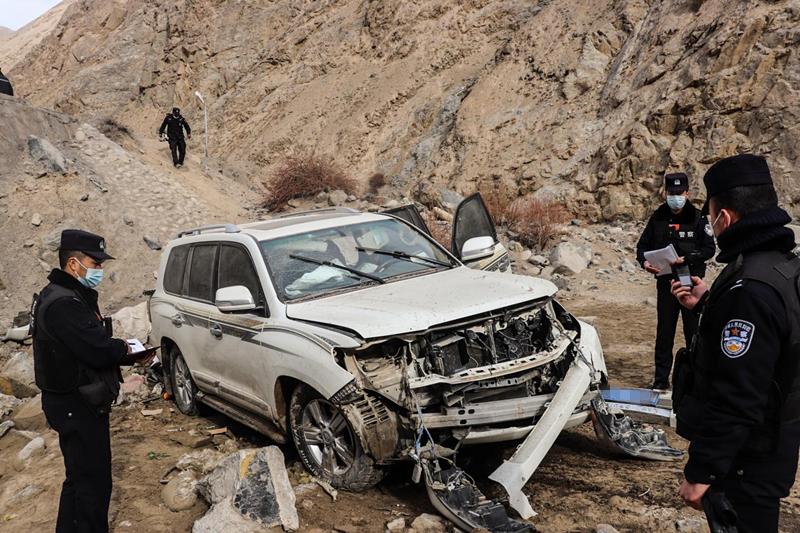 民警查看事故现场情况库地边境检查站常年驻守在新藏线上,担负着新藏线上的事故救援工作。多年来,参与事故救援300起,救助旅客500余人,被称为天路上的2高原救助站”。(张文文)