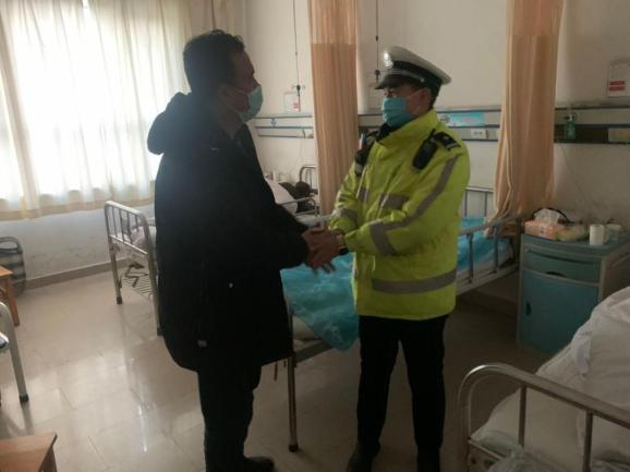 王女士的亲属拉着执勤交警的手连声感谢2月8日,王女士脱离生命危险转至普通病房。(严万海)
