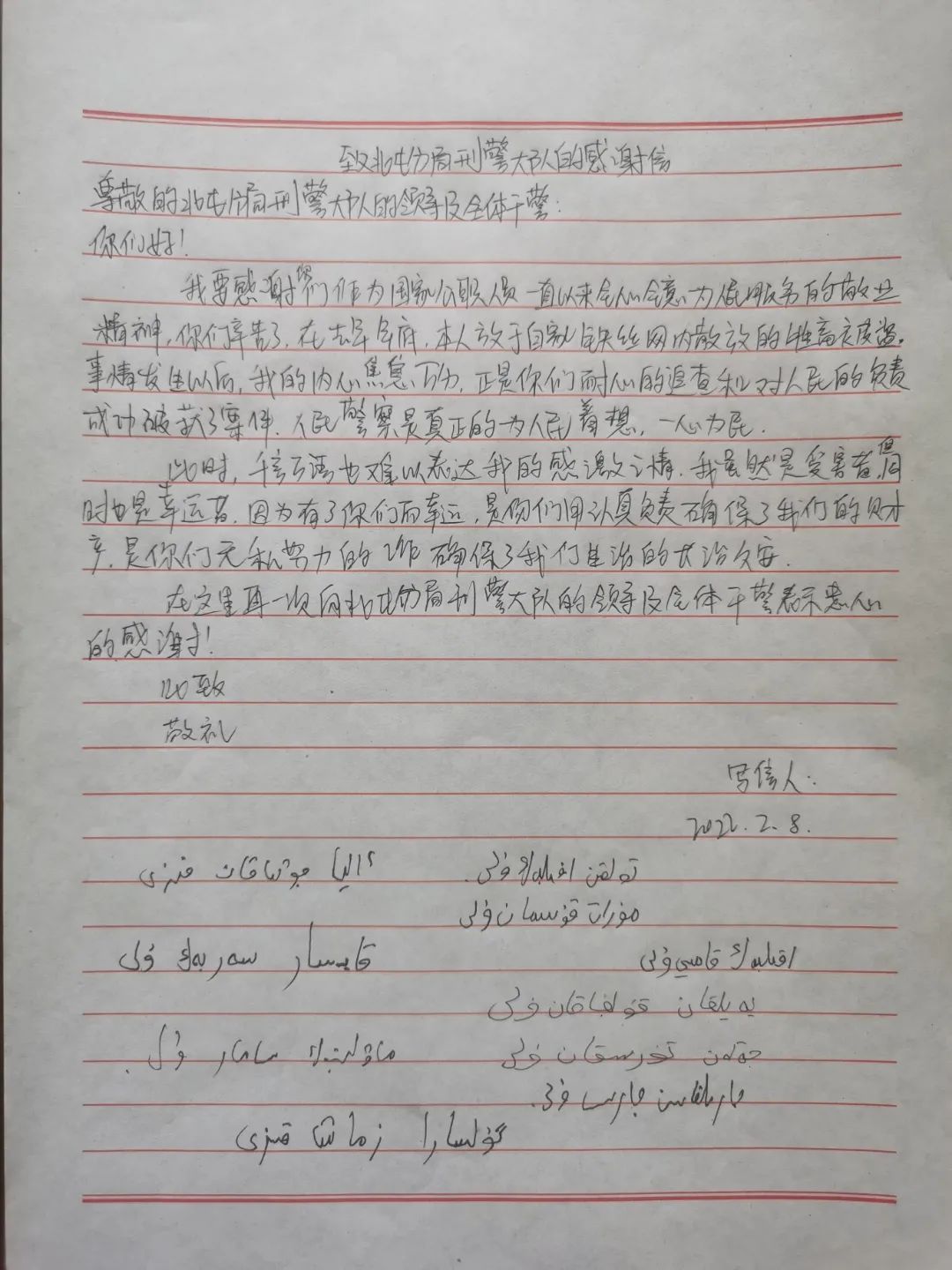 2月8日,一封10名群众联名写来的感谢信让阿勒泰地区阿勒泰市公安局的民警们感动不已。这封感谢信几经辗转到了北屯分局刑警大队民警手中。