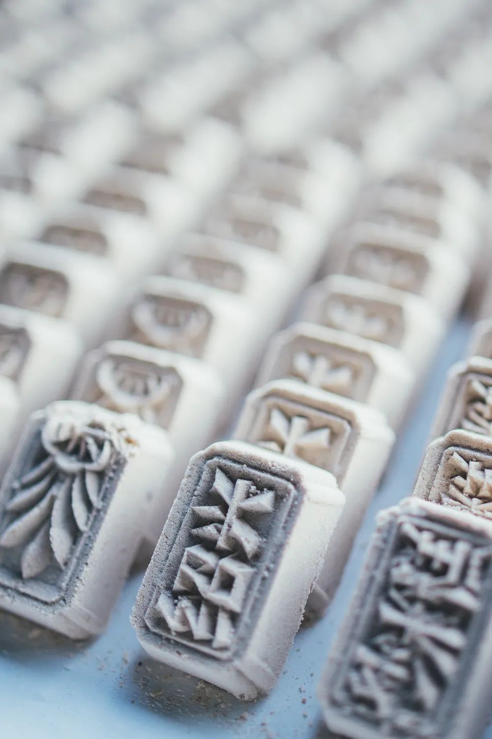 著名的定胜糕,形状既像元宝,又像古建筑构件里的“定榫”。它原为“定榫糕”,是乔迁之喜的必备糕团;淡红色的糕体,由红曲粉天然着色,表皮是高贵的磨砂质地;它个头不大,松软之余是豆沙细腻的甜味。