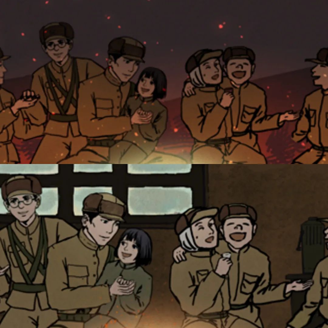 动画里有一个镜头是士兵们一起坐在屋里烤着火很欢乐的场景。