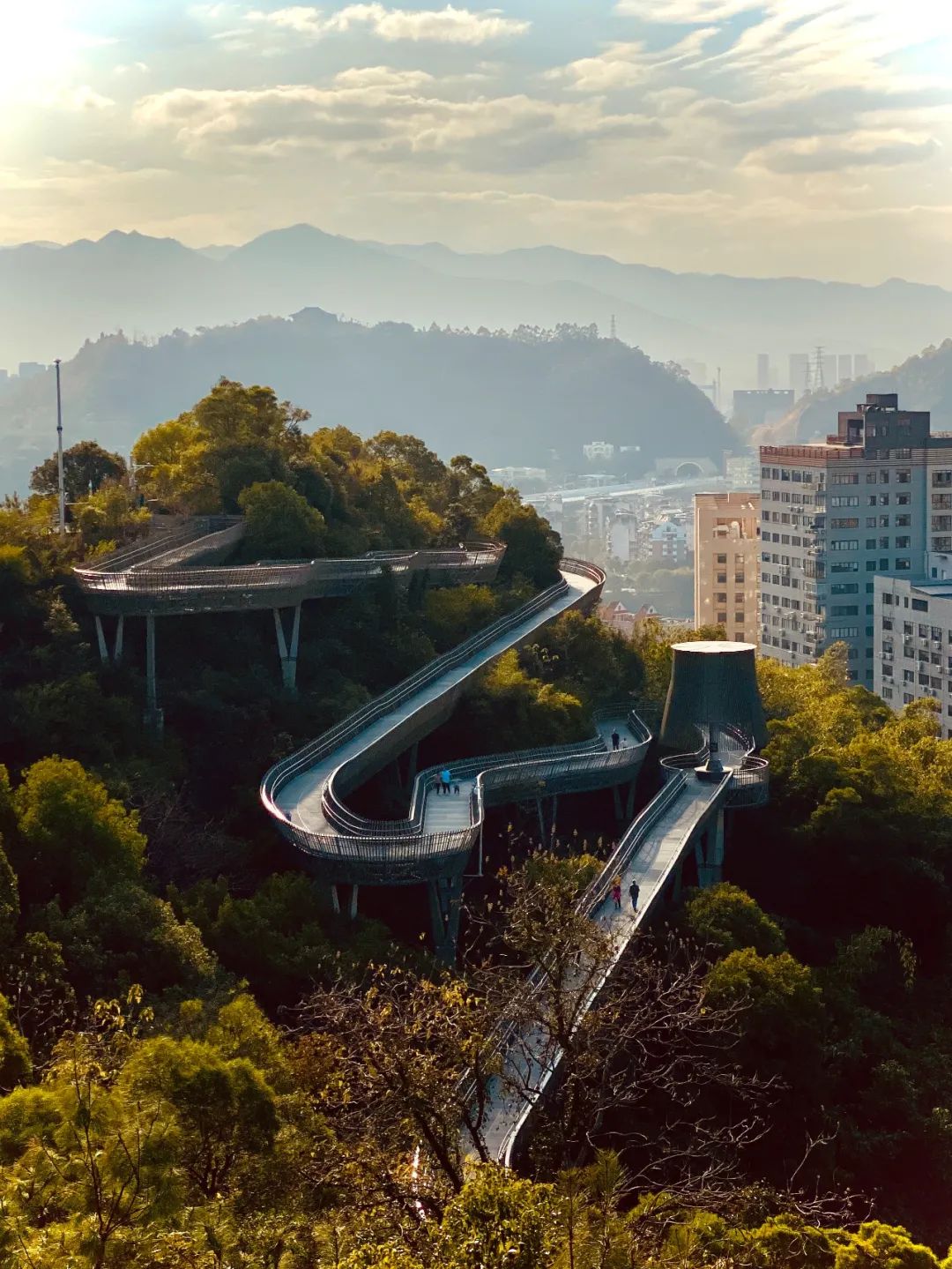 △福州有几番江南的温婉/unsplash福道是福州首条城市山水生态休闲健身走廊,全线长19公里,东北连接左海环湖栈道,西南连闽江,贯穿福州五大公园,镂空的栈道随着山势蜿蜒而上,穿行于山林树木之间,步步是景,令人心旷神怡。