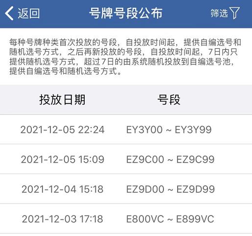 因新能源小型汽车非纯电动号牌资源库存的投放需求,现于2月18日分别投放现场随机“50选1”号牌号段EF40000-EF49999、EF50000-EF59999、EF60000-EF69999、EF70000-EF79999共计40000副,互联网预选号牌号段EF80000-EF89999、EF90000-EF99999、EFA0000-EFA9999、EFB0000-EFB9999共计40000副到号牌备用库,当选号库号牌资源少于规定数量时,系统随机将备用库号牌资源投放入选号库。