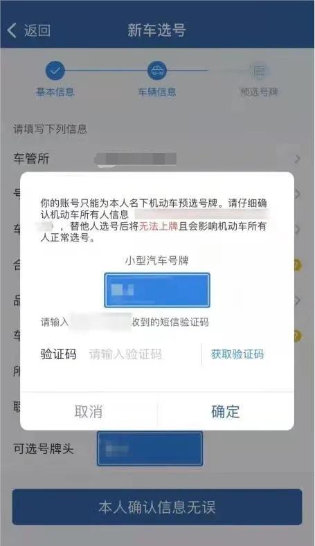 2、选号时系统会要求确认车主信息,请务必确认与选号车辆购买人(单位)一致后再进行选号操作。