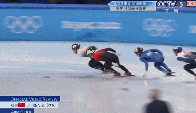 ▲在短道速滑男子1500米1/4决赛中任子威位列小组第一,晋级半决赛。小组比赛中有人摔出赛道,也有选手间发生身体接触。直播画面显示,任子威高举双手,示意自己未与其他选手发生接触。02