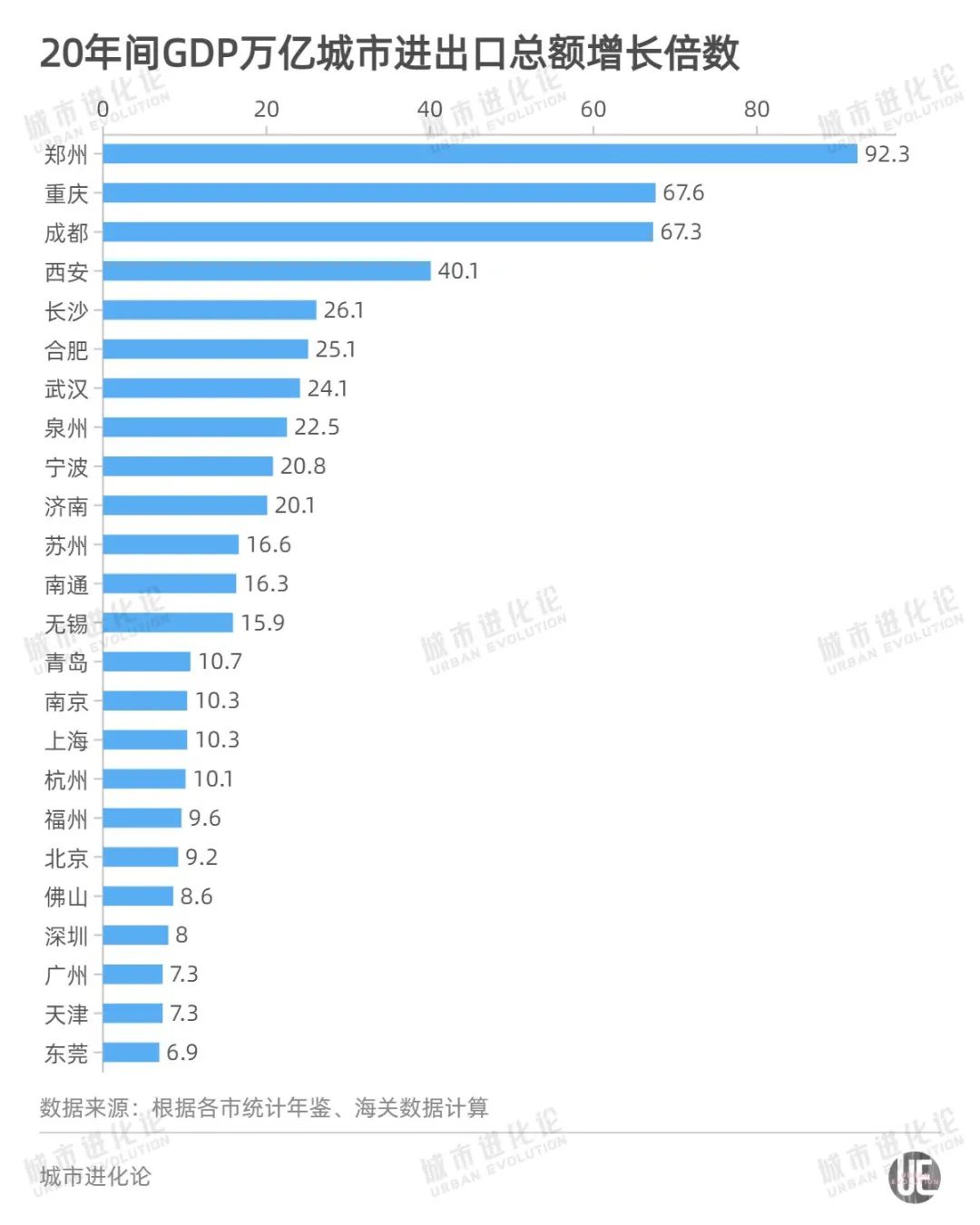 过去一年,全国外贸实现超预期增长,万亿级城市外贸也表现出强劲的回温势头,济南、泉州、福州、青岛和北京分别以40.1%、32.7%、32.6%、32.4%和30.6%的增速位列前五。而纵观过去20年,郑州外贸实现92.3倍(以美元计)的增长,成为“入世”最大受益者,紧随其后的重庆、成都两座西部“双子星”,外贸规模也分别实现67.6、67.3倍的强劲增长。