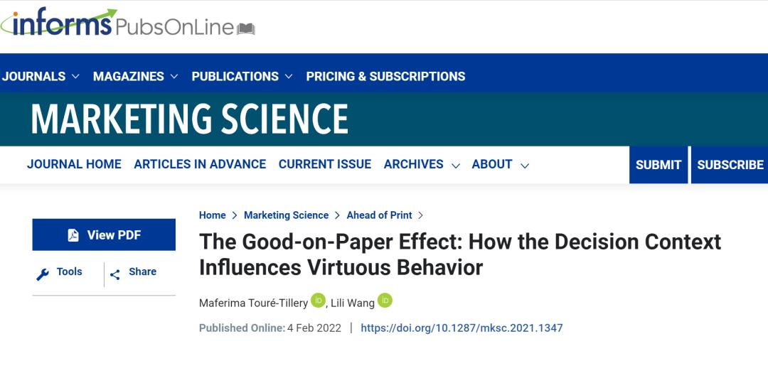 2022年2月4日,浙江大学管理学院教授王丽丽(通讯作者)及其团队在营销学科国际顶级期刊MARKETING SCIENCE(管理学UTD24期刊之一)上在线发表了一篇题为“The Good-on-Paper Effect: How the Decision Context Influences Virtuous Behavior”的文章。