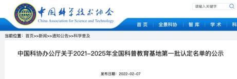 近日,中国科协官网对2021-2025年全国科普教育基地第一批认定名单进行公示。