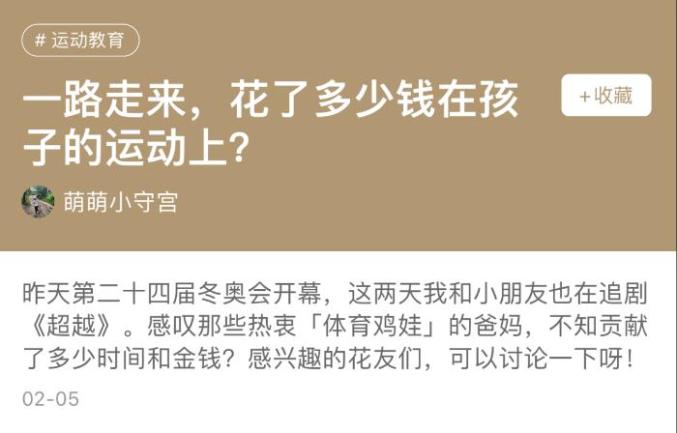 好,下面我们就分三个年龄段(0-5岁学前,5-10岁小学阶段,10岁+大孩子),摘取一些有代表性的花友“运动花费经验”在此分享;大家可以看看,同龄孩子都在玩什么运动,在时间、金钱上的投入各自是怎样的。