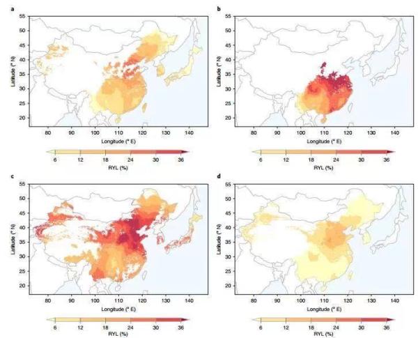 臭氧污染对(a)常规水稻、(b)杂交水稻、(c)小麦和(d)玉米相对产量损失影响的空间分布特征 受访者供图