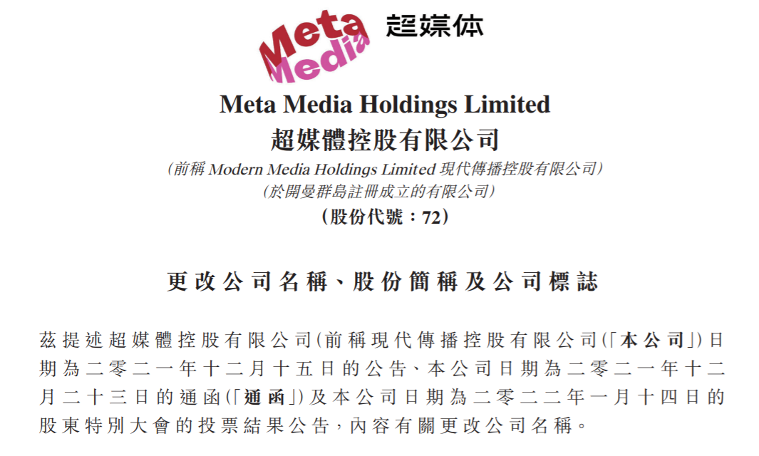 现代传播董事会还在公告中表示,有关将公司英文名称由“Modern Media Holdings Limited”更改为“Meta Media Holdings Limited”,以及中文双重外文名称由“现代传播控股有限公司”更改为“超媒体控股有限公司”的建议,已根据开曼群岛公司注册处处长发出的公司更改名称注册证书,自2022年1月14日起生效。
